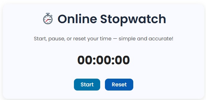 The ToolsHub Stopwatch is designed with a clean interface, large readable digits, and start/stop/reset functionality — perfect for both personal and professional use.