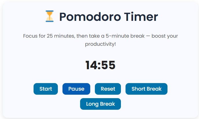 The ToolsHub Pomodoro Timer online tool is a simple, ad-free online timer designed to help you work smarter, not harder.